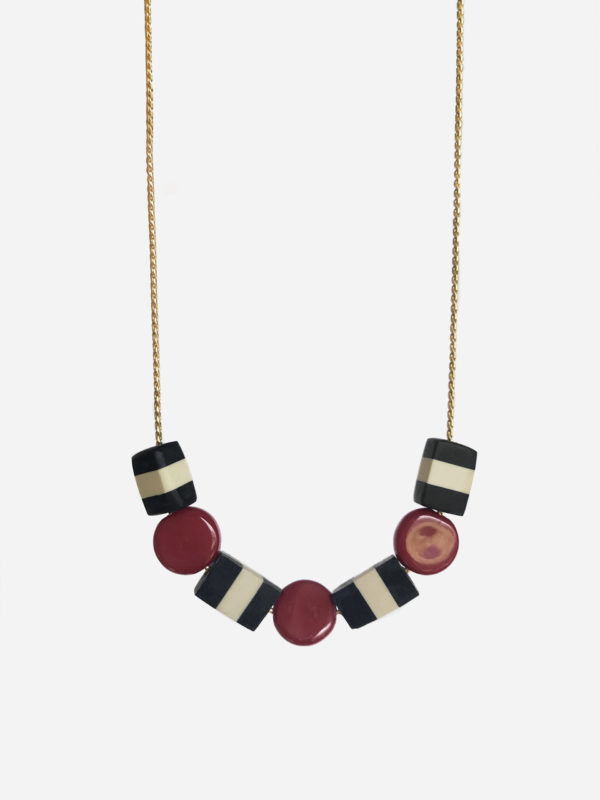 Collar de cuentas geométricas que combina el granate con las rayas blancas y negras, y el brillo del cristal con el mate de la arcilla polimérica.
