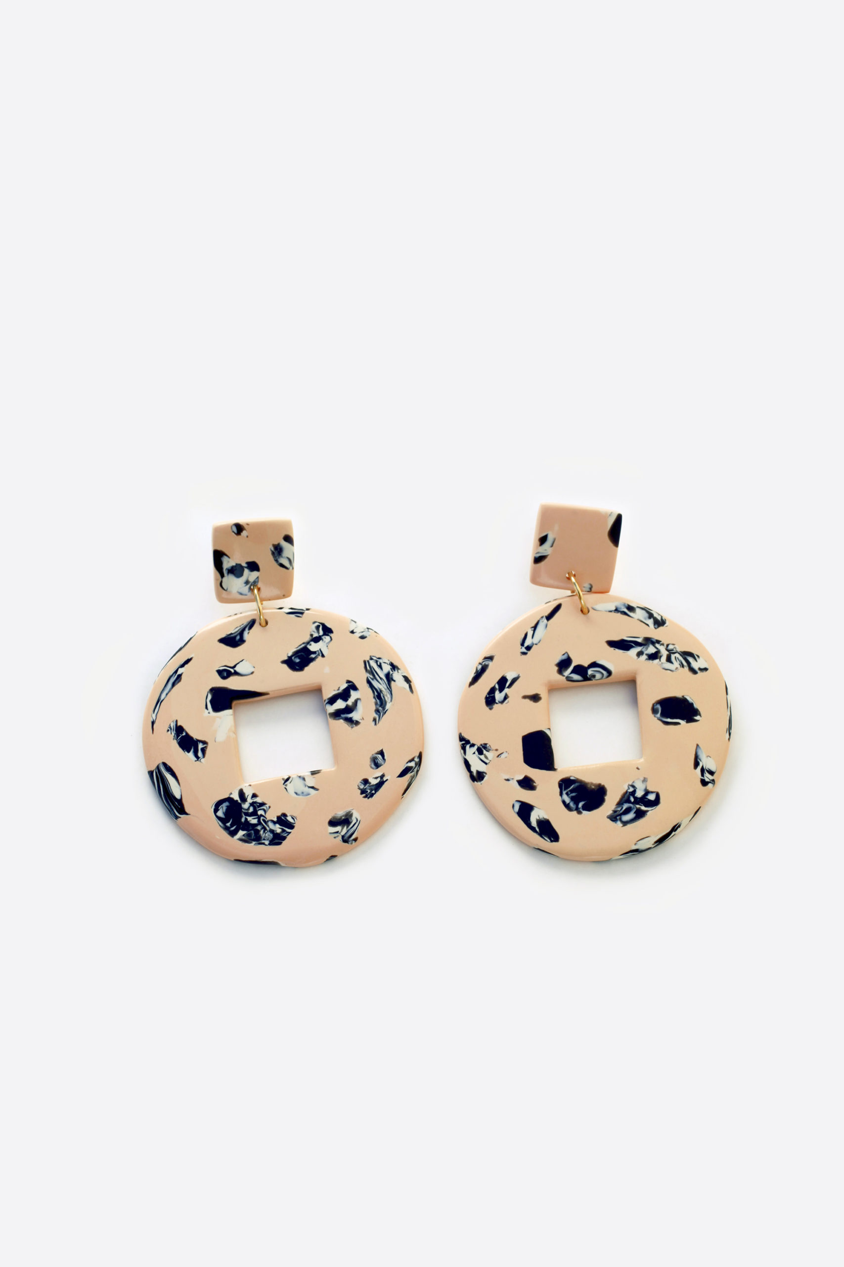 Pendientes grandes redondos de diseño moderno que combina geometría orgánica con textura visual que imita a piedras. En rosa palo, negro y crema.